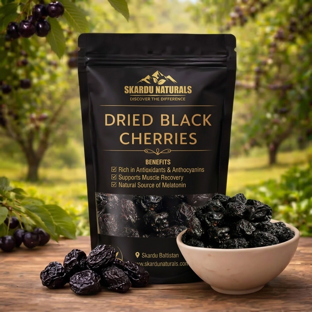 Premium quality Dried Black Cherries seed less by Skardu Naturals — naturally sun-dried, rich in antioxidants, and perfect for healthy snacking. No artificial additives, 100% pure & fresh from the mountains.